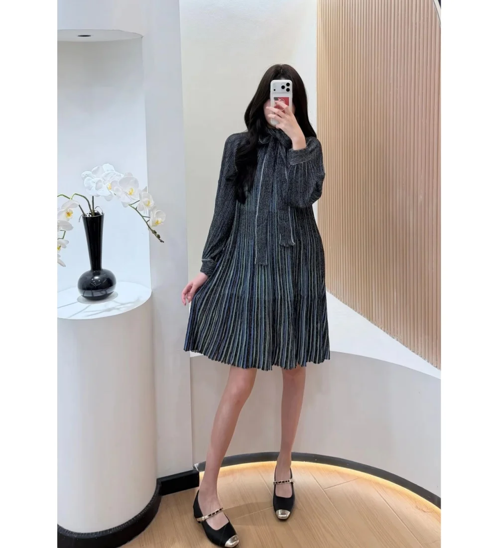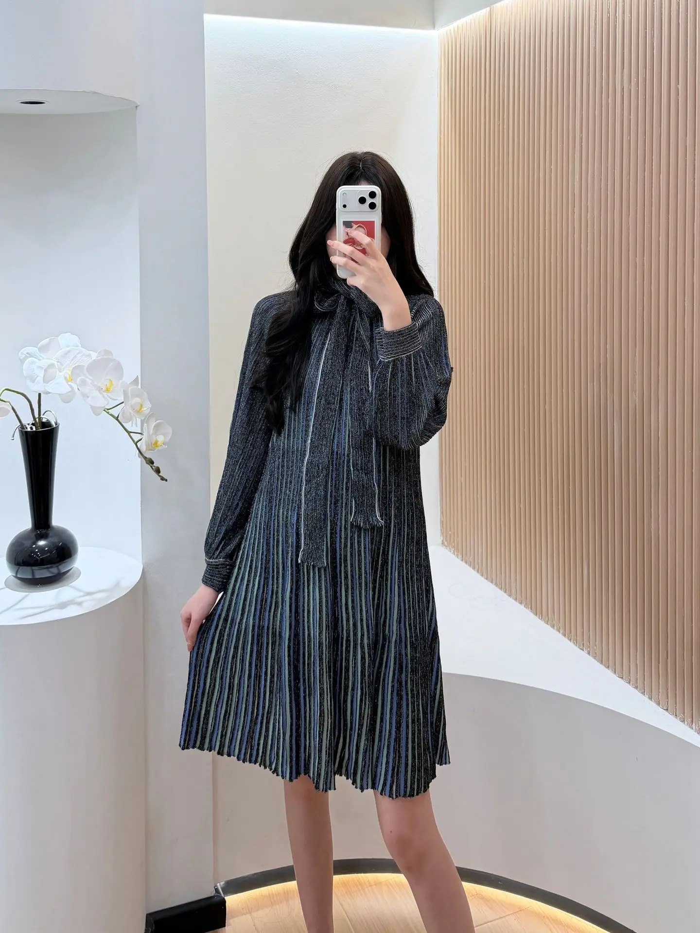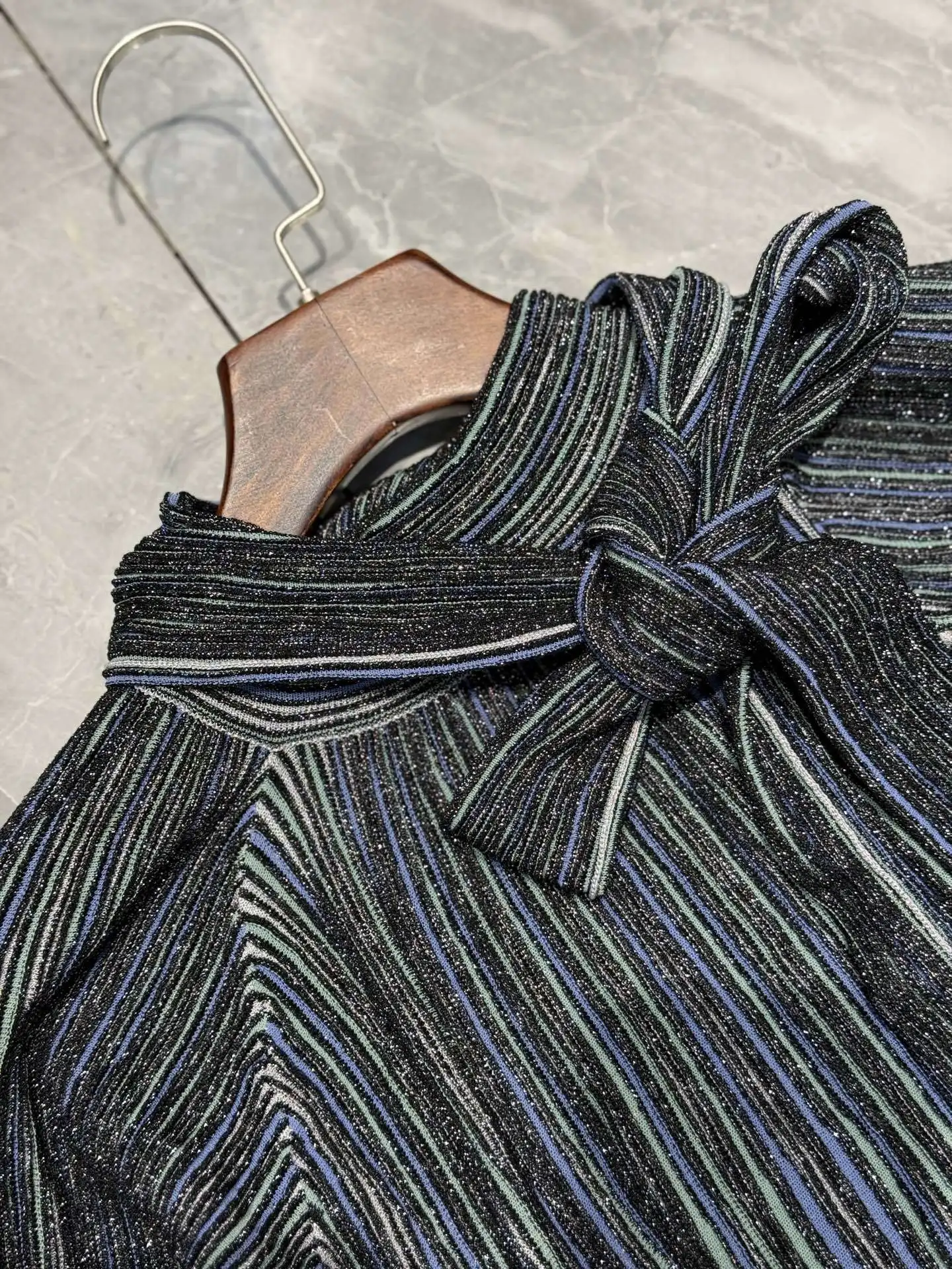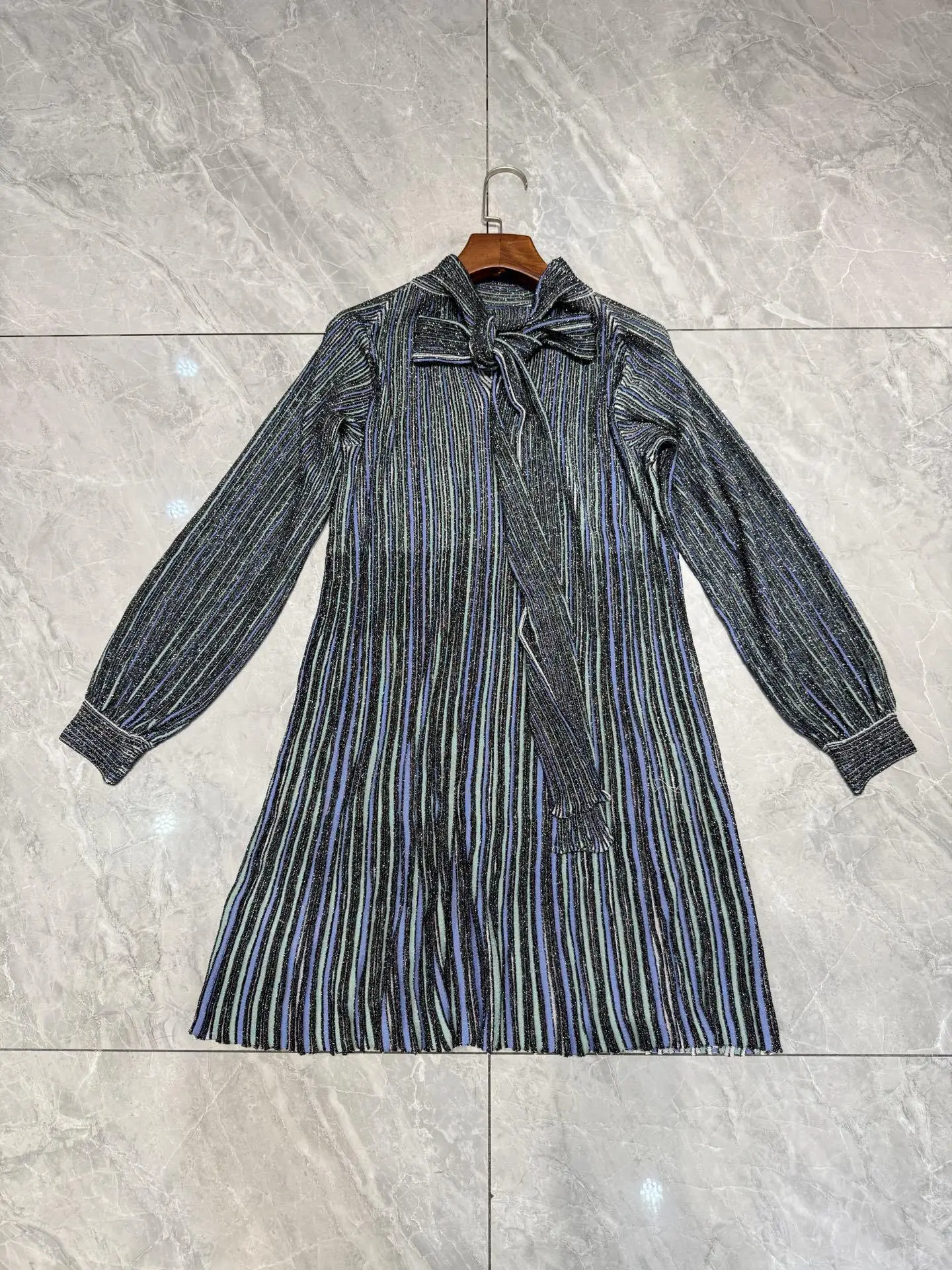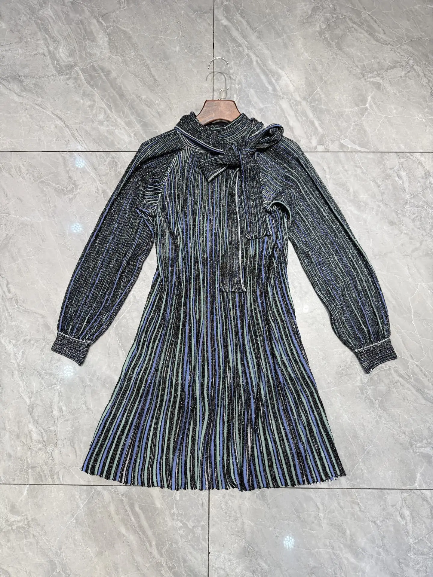 Bettergirl 2026 Ramadan Retro multi-color striped bow contrasting long sleeved knitted high stretch dress